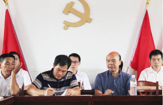 圖為在保全村村委會(huì)議室,鑫旺竹木制品廠廠長(zhǎng)諸葛福成與保全村貧困戶簽訂勞動(dòng)合同現(xiàn)場(chǎng)