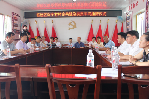 7月5日,臨桂區(qū)兩江鎮(zhèn)保全村舉行“扶貧車間”掛牌儀式。臨桂區(qū)人社局、林業(yè)局、兩江鎮(zhèn)等單位相關(guān)負(fù)責(zé)人以及保全村村委干部、鑫旺竹木制品廠廠長(zhǎng)、保全村貧困戶代表、桂林市小微企業(yè)融資擔(dān)保有限公司(以下簡(jiǎn)稱“我公司”)全體人員參加了掛牌儀式。