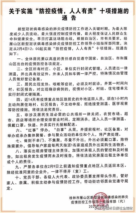 根據(jù)自治區(qū)、市有關(guān)要求,經(jīng)雁山區(qū)新型冠狀病毒感染肺炎疫情防控工作領(lǐng)導(dǎo)小組指揮部同意,決定從2月4日12:00起實(shí)施“防控疫情,人人有責(zé)”十項(xiàng)措施?,F(xiàn)通告如下: