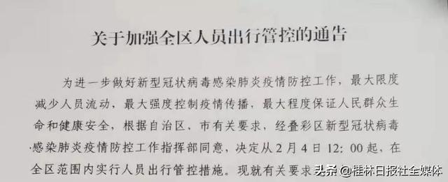 隨著疫情防控的升級(jí),全國(guó)多地實(shí)施居民出行管控措施。繼桂林市秀峰區(qū)之后,2月4日,桂林市疊彩區(qū)和雁山區(qū)也相繼發(fā)布通告,嚴(yán)格控制人員出行。