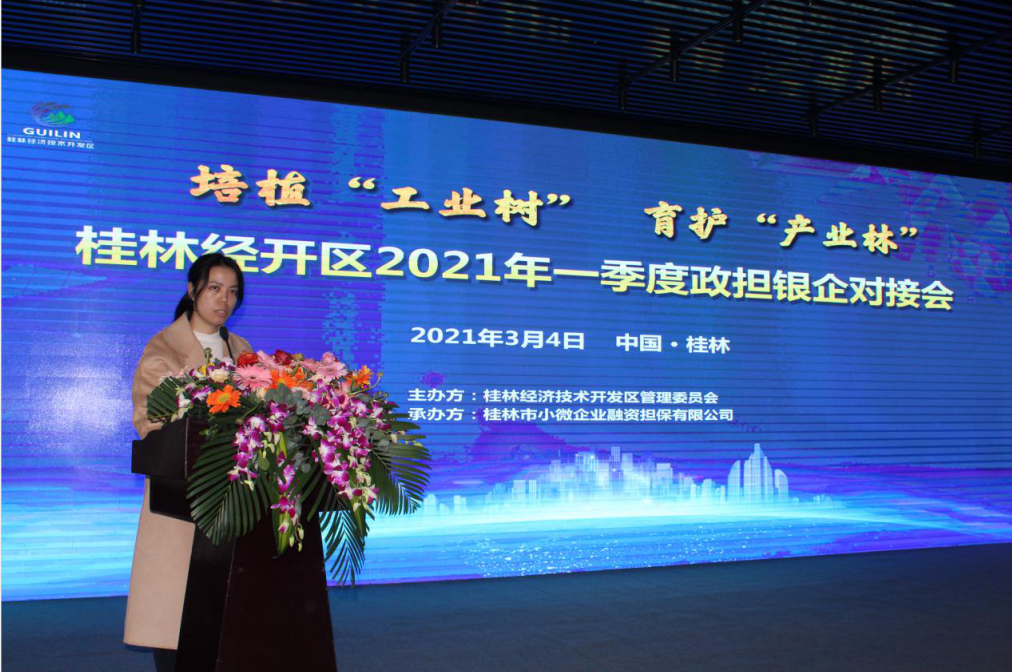 為積極響應桂林市委、市政府提出的工業(yè)振興發(fā)展戰(zhàn)略和“培植工業(yè)樹、護育產業(yè)林”的號召,進一步落實普惠金融政策,引入金融活水服務市經開區(qū)企業(yè)。3月4日上午,桂林市小微企業(yè)融資擔保有限公司(以下簡稱為“桂林小微擔保”)聯(lián)合桂林市經開區(qū)舉辦“政擔銀企”對接會。出席會議的有經開區(qū)黨工委副書記管委會常務副主任趙家維、市金融辦副主任姜路、桂林小微擔保總經理劉巖、市財政局金融科副科長唐敏、中國銀行等14家金融機構及經開區(qū)63家重點企業(yè)負責人共計110人。